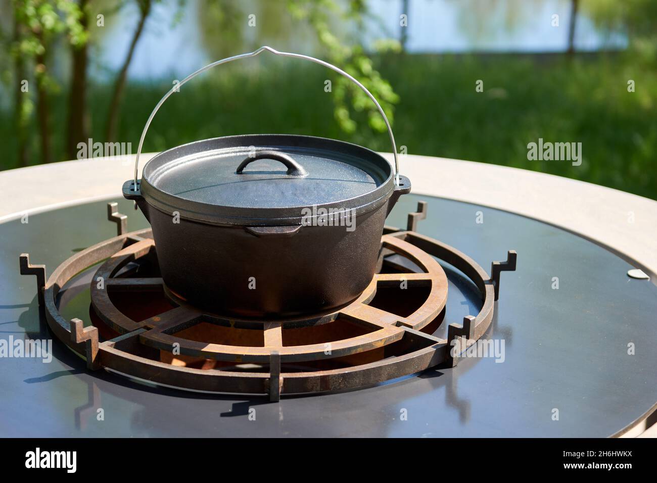 Flaming Charcoal In Kettle Grill Pit with Cast Iron Grid Round table